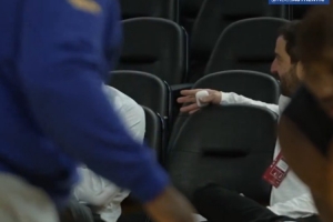 有人拍到邓利维的经纪人与勇士总经理邓利维在场边聊天,而库明加在镜头近景训练。